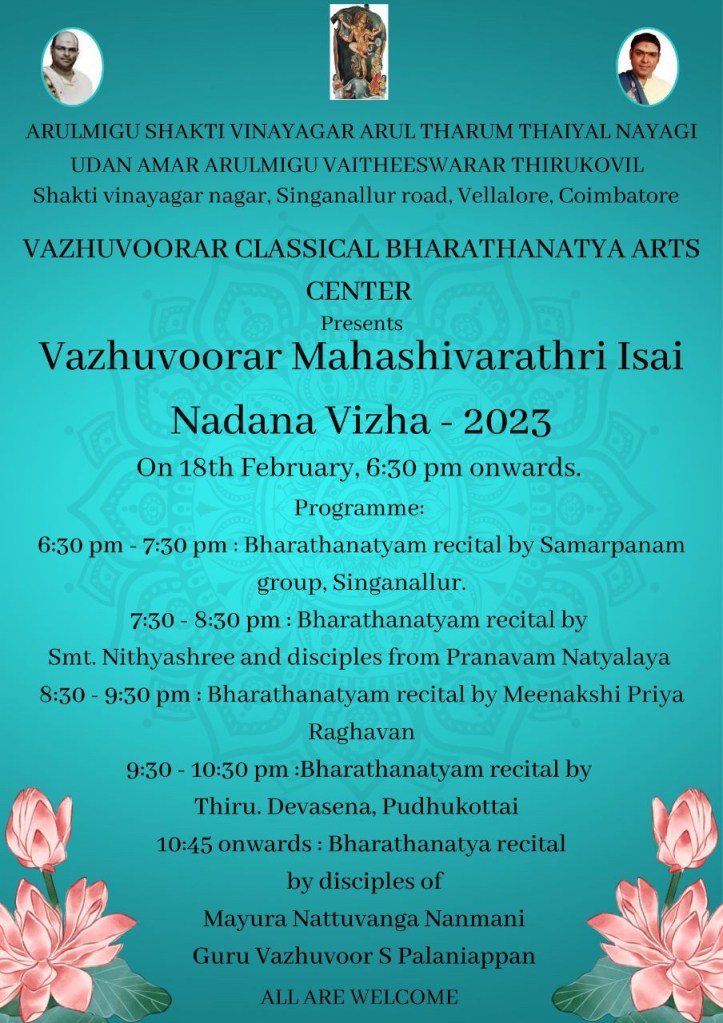 Posted on February 13, 2023February 18, 2023 5 TH VAZHUVOORAR MAHA SIVARATHRI NATYANJALI 18/02/2023 18 th time 6pm Share this: Click to share on WhatsApp (Opens in new window) WhatsApp Like Loading... Related