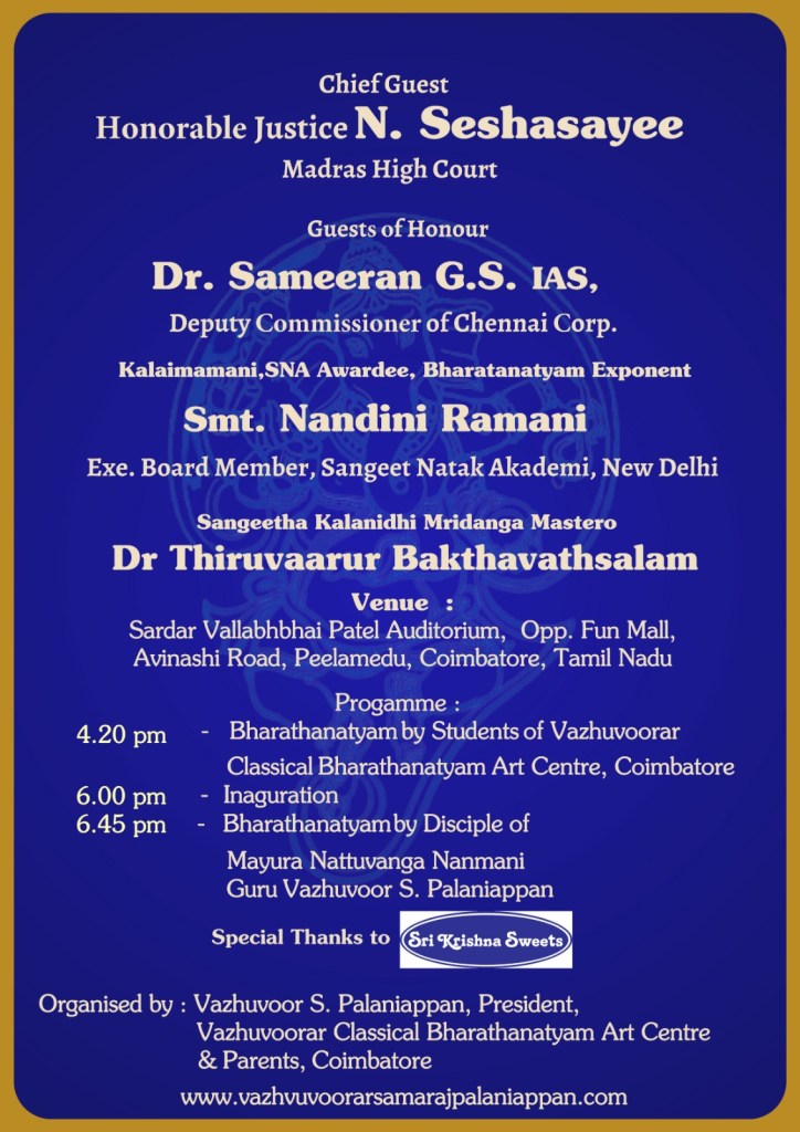 Posted on May 29, 2023August 17, 2023 VAZHUVOORAR KALAI VIZHA ON 04/06/2023 AT COIMBATORE ALL ARE WELCOME VAZHUVOORAR LIFETIME ACHIEVEMENT AWARD To Dr Sonal Mansingh Vazhuvoor Samraj Memorial Award To Smt. Shobha Ramesh Share this: Click to share on WhatsApp (Opens in new window) WhatsApp Like Loading... Related